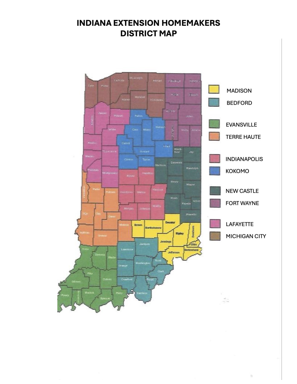 Indiana is divided into 10 districts for Extension Homemakers. Locate the district representative for your area to stay connected and informed.